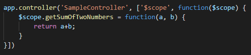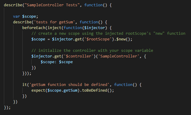 After that glob of code, that single it segment will test whether your SampleController has a getSum function. The inject bit is how the injector service is used to get instances of your controllers, providers and services from your angular module.